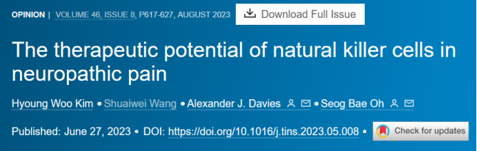 [2] Kim HW, Wang S, Davies AJ, Oh SB. The therapeutic potential of natural killer cells in neuropathic pain. Trends Neurosci. 2023;46(8):617-627. doi:10.1016/j.tins.2023.05.008